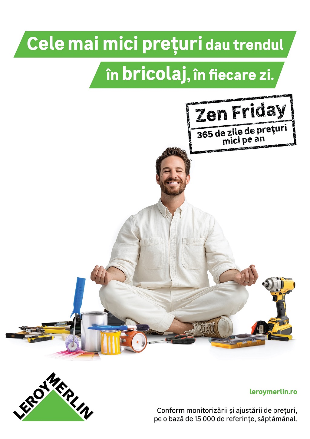 Leroy Merlin, retailer specializat în construcții, decorațiuni și grădinărit, anunță lansarea unei noi ediții a campaniei „Zen Friday”, o inițiativă care reafirmă promisiunea companiei de a oferi cele mai mici prețuri în fiecare zi, fără a depinde de valurile de reduceri sezoniere. Prin această campanie, compania invită clienții să se bucure de o experiență calmă, predictibilă și echilibrată, fără presiunea ofertelor limitate sau a reducerilor de moment.