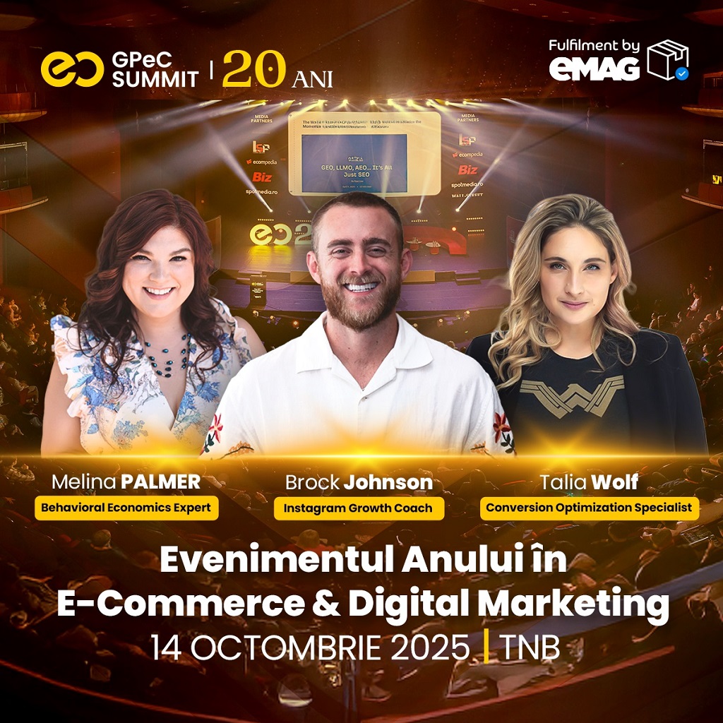 Pe 14 octombrie are loc GPeC SUMMIT – Evenimentul Anului în E-Commerce și Digital Marketing care se va desfășura la Teatrul Național București și este considerat cel mai important eveniment de profil din Europa Centrală și de Est, ajuns la al 20-lea an de tradiție. Organizatorii aduc pe scenă unii dintre cei mai apreciați speakeri de-a lungul timpului, dar și speakeri în premieră în România, pregătind un line-up de tip “Best Of” prin care marchează ediția aniversară de 20 de ani. Biletele sunt disponibile spre vânzare pe site-ul GPeC.ro, iar prețul pornește de la doar 89 EUR + TVA/persoană până pe 22 septembrie, când expiră oferta Early-Bird.